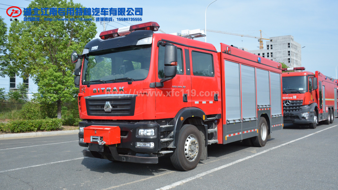 江特牌JDF5180GXFAP55/Z6型壓縮空氣泡沫消防車,采用中國重汽集團(tuán)濟(jì)南商用車有限公司生產(chǎn)的汕德卡 ZZ5206N471GF5消防車底盤改裝而成。整車由消防員乘員室和車身兩大部分組成,乘員室為原裝雙排駕駛室,可乘坐 2+4 人,該車為內(nèi)藏罐結(jié)構(gòu),車身前部為器材箱,中部為水罐,水罐兩側(cè)為器材箱,后部為泵房。載液罐體為304不銹鋼,與底盤采用彈性連接,載水4700kg,泡沫液量900kg(A類泡沫350KG+B類泡沫550KG)。壓縮空氣泡沫系統(tǒng)使用德川牌(國產(chǎn)知名品牌)A 類自動壓縮空氣泡沫滅火系統(tǒng),茸申牌(國產(chǎn)知名品牌)CB10/80-RS型消防泵,NK100-V001 型空氣壓縮機(jī)與泡沫比例混合系統(tǒng)配套使用,空壓機(jī)排量:4.5m3/min,空壓機(jī)工作壓力:0.85MPa,空壓機(jī)最大工作壓力:1.5MPa。壓縮空氣泡沫消防車廣泛應(yīng)用于地下、石油、化工、大型商場、高層住宅、重點(diǎn)文物、車站碼頭等。特別節(jié)省水和泡沫液,高效環(huán)保,而且不會造成二次傷害。系統(tǒng)操作簡單,免維護(hù),一鍵即可出 CAFS,使用完后無需對泡沫泵進(jìn)行清洗。