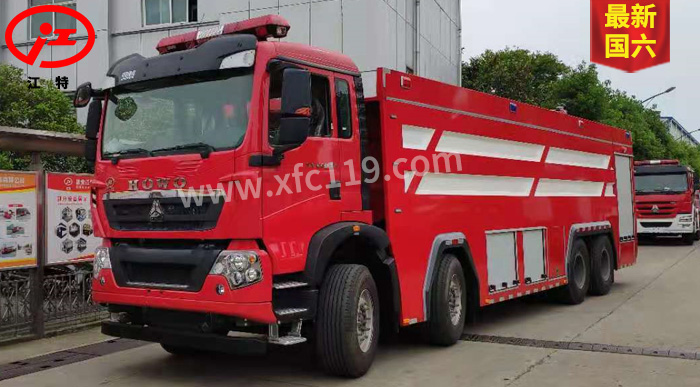 JDF5420GXFPM240/Z6型重型泡沫消防車為國六消防車車型,采用重汽豪沃ZZ5447TXFV466MF1底盤改裝而成。整車由消防員乘員室和車身兩大部分組成,乘員室為原裝單排,可乘坐2人,該車為外露罐結構,中部為罐體,后部為泵房。載液罐體為優質碳鋼,內部噴涂環氧底漆及環氧瀝青漆,與底盤采用彈性連接,載水量21260kg,泡沫液量2990kg(PM240),裝備了上海茸申消防設備有限公司生產CB10/80-1RS型常壓消防泵,額定流量80L/S,車頂安裝成都威斯特消防機械有限公司生產的PL8/64型車用消防炮。該車最大的特點是載液量大、操控性好、維修簡便。可廣泛應用于公安消防隊、廠礦企業及社區、碼頭等場所,撲救大型油類火災和一般物質火災。