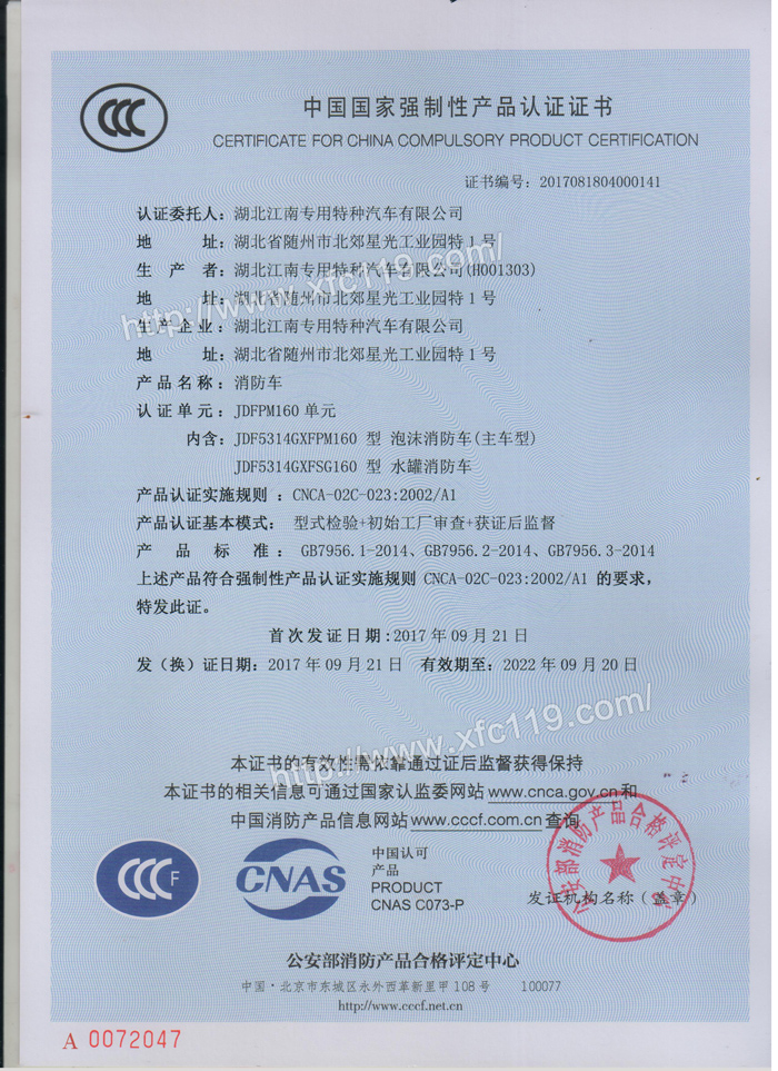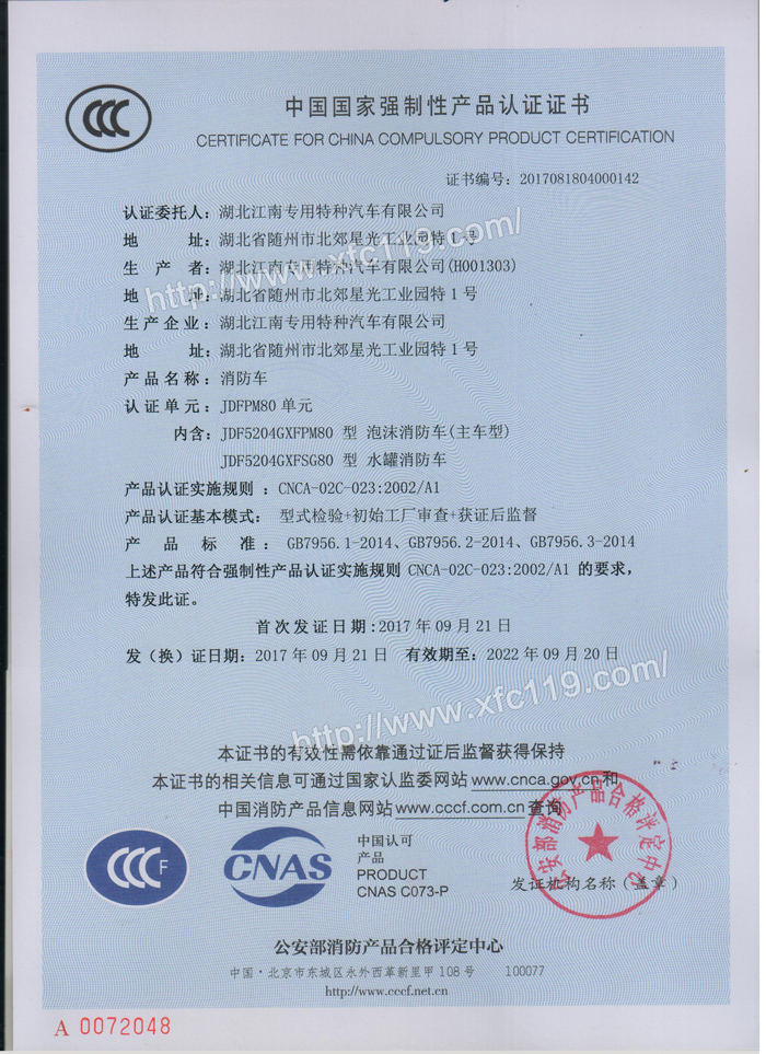 熱烈慶賀我公司湖北江南專用特種汽車有限公司國五消防車3C已率先批下,領跑全國,是消防車廠家里面國五消防車車型第一批下發3C的企業,這也證明了我公司的國五消防車車型質量,技術方面全面得到國家認可和好評。歡迎新老客戶來我廠考察選購消防車車型及邀約我公司參加各公司各政府單位消防車項目招標活動。