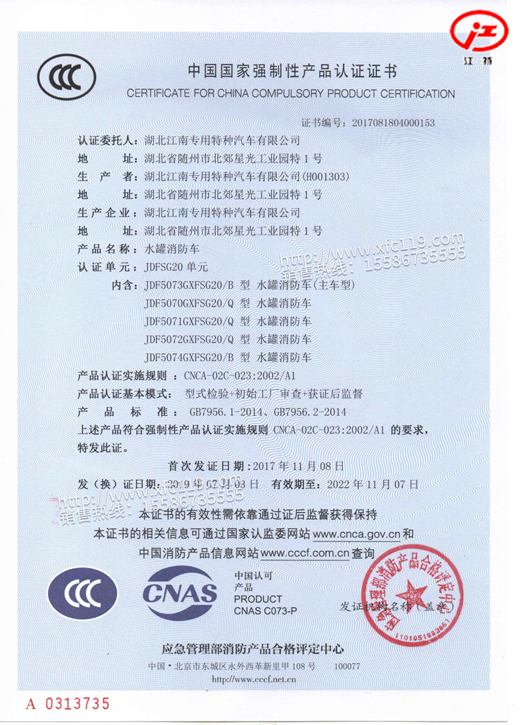 該款消防車車型為目前國內(nèi)最新的國五消防車,軸距3360mm,整車型號為JDF5074GXFSG20/B型水罐消防車,底盤采用福田BJ1073VEADA-C2改裝,采用該款底盤生產(chǎn)的消防車的公告目前我公司湖北江南專用特種汽車有限公司率先完全并下發(fā)。