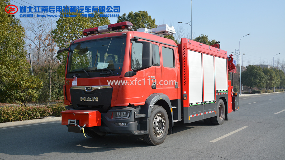 MAN搶險救援消防車為國六消防車車型,是我公司湖北江南專用特種汽車有限公司應用新技術、新工藝,自主研制開發的具有自主知識產權的最新消防車產品,該搶險救援消防車系選用德國曼恩商用車有限公司生產的TGM18.290二類汽車底盤改裝而成,原裝雙排駕駛室,可載含駕駛員在內的乘員6人,駕乘舒適輕便。 根據用戶需要可配備有偵檢類、警戒類、救生類、破拆類、照明類、個人防護類各種搶險救援器材。器材安裝在抽拉拖板、立式抽拉、旋轉拉架上。整車線型流暢、外觀新穎、美觀大方、器材布置合理緊湊、取拿方便,是消防部隊和企業進行搶險救援領域的好幫手。