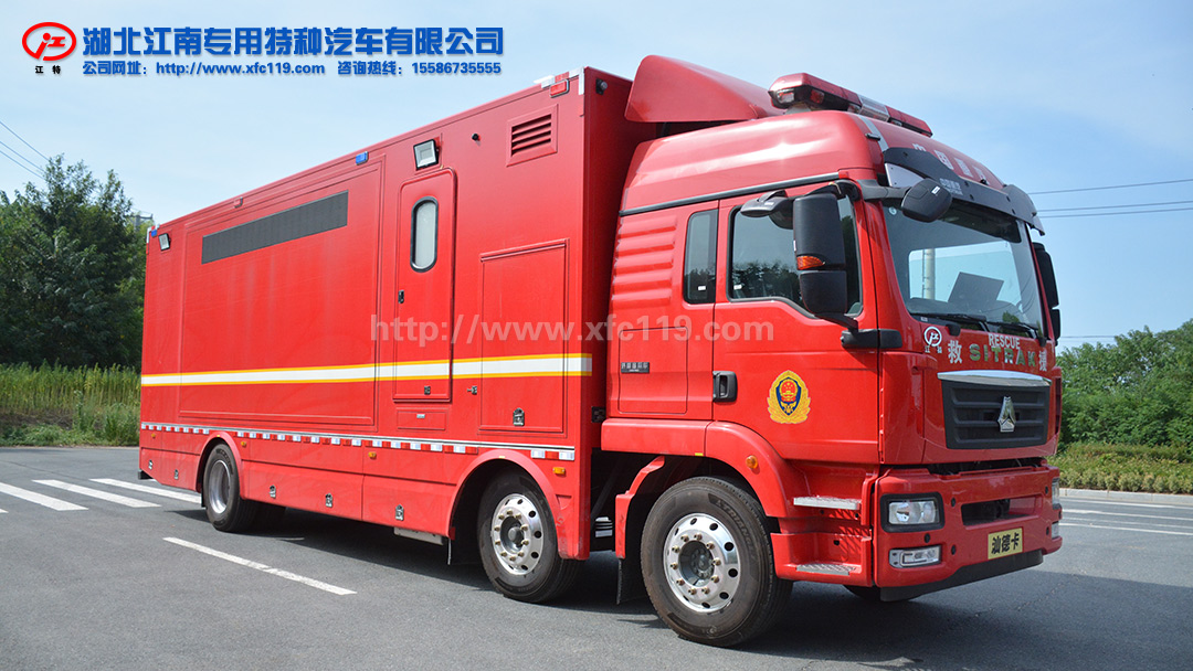 宣傳消防車整車上裝為整體式框架結構,龍骨采用優質型材焊接,外蒙皮為冷軋板材焊接,廂體外廓采用航空鋁型材包角,滿足輕量化和整車強度要求。車身左側配備超大戶外全彩LED大屏幕及音影系統,車輛頂部四周配備頻閃警燈,下裙邊設計制作專用雜物艙;車身中部和尾部分別設有側開門,并配有暗藏式登車梯和快拆式扶手,車門、艙門均采用專用型材結構,可靠性高并具有良好的密封性;廂體內采用優質塑膠地板,防滑防腐耐酸耐堿抗霉菌;廂體四壁及頂部骨架填充隔音隔熱材料,室內裝飾采用墻壁軟裝工藝皮革包覆,車內整體采用淺色系色調,造型美觀易于清洗。整車優質烤漆工藝主色為消防紅,配備消防制式外觀車貼。