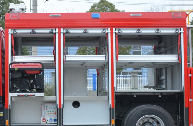 右側(cè)后器材艙布置有立式旋轉(zhuǎn)拓展板,前板裝配有雙層器具收納盒,收納存放小型工具和專用器材,背板采用掛式支架,收納專用扳手、卡鉗、剪刀等器具;右側(cè)前器材艙布置有立式抽拉拓展板機(jī)構(gòu),采用重型多節(jié)滑軌抽拉式結(jié)構(gòu),方便消防員快速取用/收納器材和專用工具等。