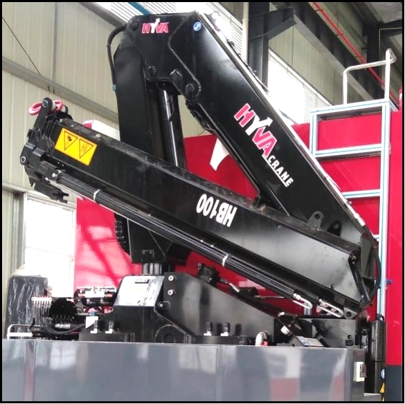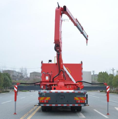 吊裝作業(yè)區(qū)主要裝備折疊臂吊裝設(shè)備,配備有伸縮臂液壓支腿及雙側(cè)操控接口,吊裝作業(yè)區(qū)左右側(cè)均配備有器材艙,放置支腿墊木等隨車器材裝備,右側(cè)還設(shè)計有登頂梯臺,配備上車?yán)旨鞍踩o(hù)欄。