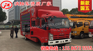 此圖片為新款國五五十鈴消防宣傳車,該車型采用重慶五十鈴公司QL1100A8MAY型國五優質底盤,軸距4475MM,配置節能環保靜音的4HK1-TC51五十鈴191馬力發動機,底盤扎實,動力強勁,機動性強。